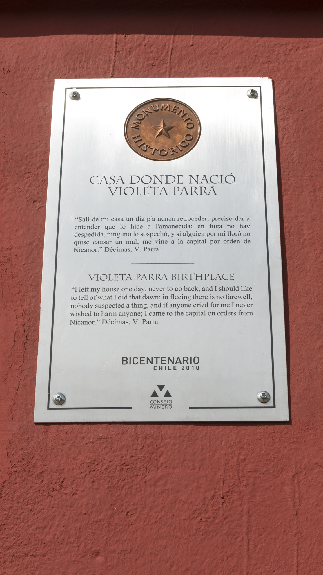 Paralelamente desarrolló su talento como folclorista e inició la composición de sus primeras canciones. Aunque Violeta Parra vivió gran parte de su vida fuera de San Carlos, esta comunidad fue testigo de sus inicios como artista, así como también fuente de inspiración para algunas de sus obras. Por esta razón, la casa de la calle El Roble donde nació y transcurrió la infancia de la folclorista, fue declarada Monumento Histórico en 1992. El inmueble de más de cien años de antigüedad, es una vivienda de fachada continua, construida en adobe y con techo de teja muslera, que pasó por muchos propietarios antes de ser declarada Monumento Histórico.