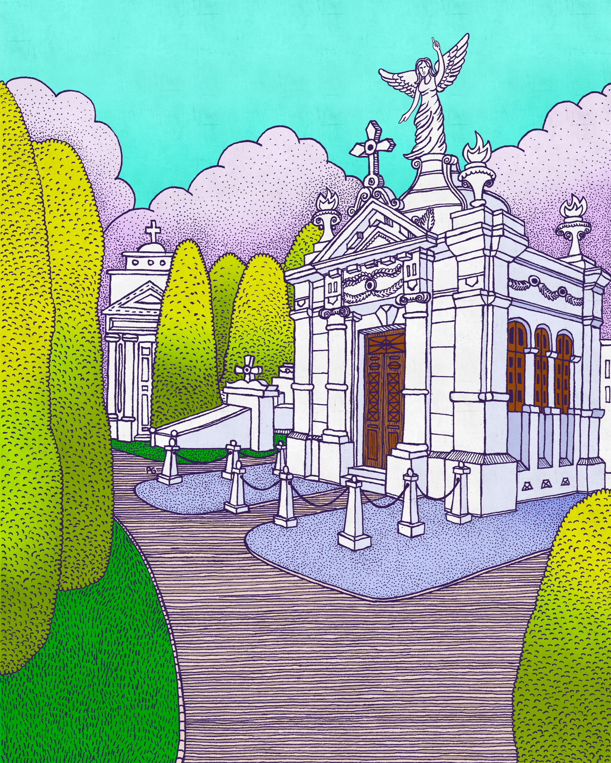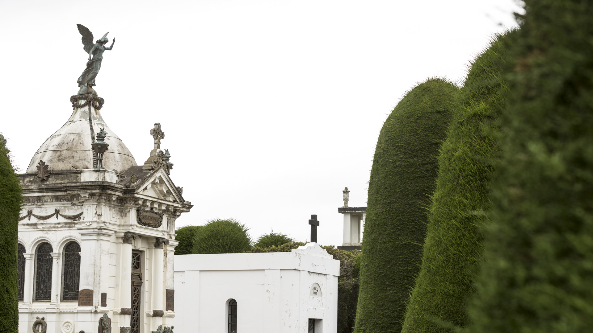 Imagina un cementerio-parque de unas 8 hectáreas, lleno de árboles muy altos, como cipreses canadienses que tienen más de 100 años. Sus caminos son avenidas que puedes recorrer y descubrir muchos monumentos, mausoleos y criptas familiares muy grandes.