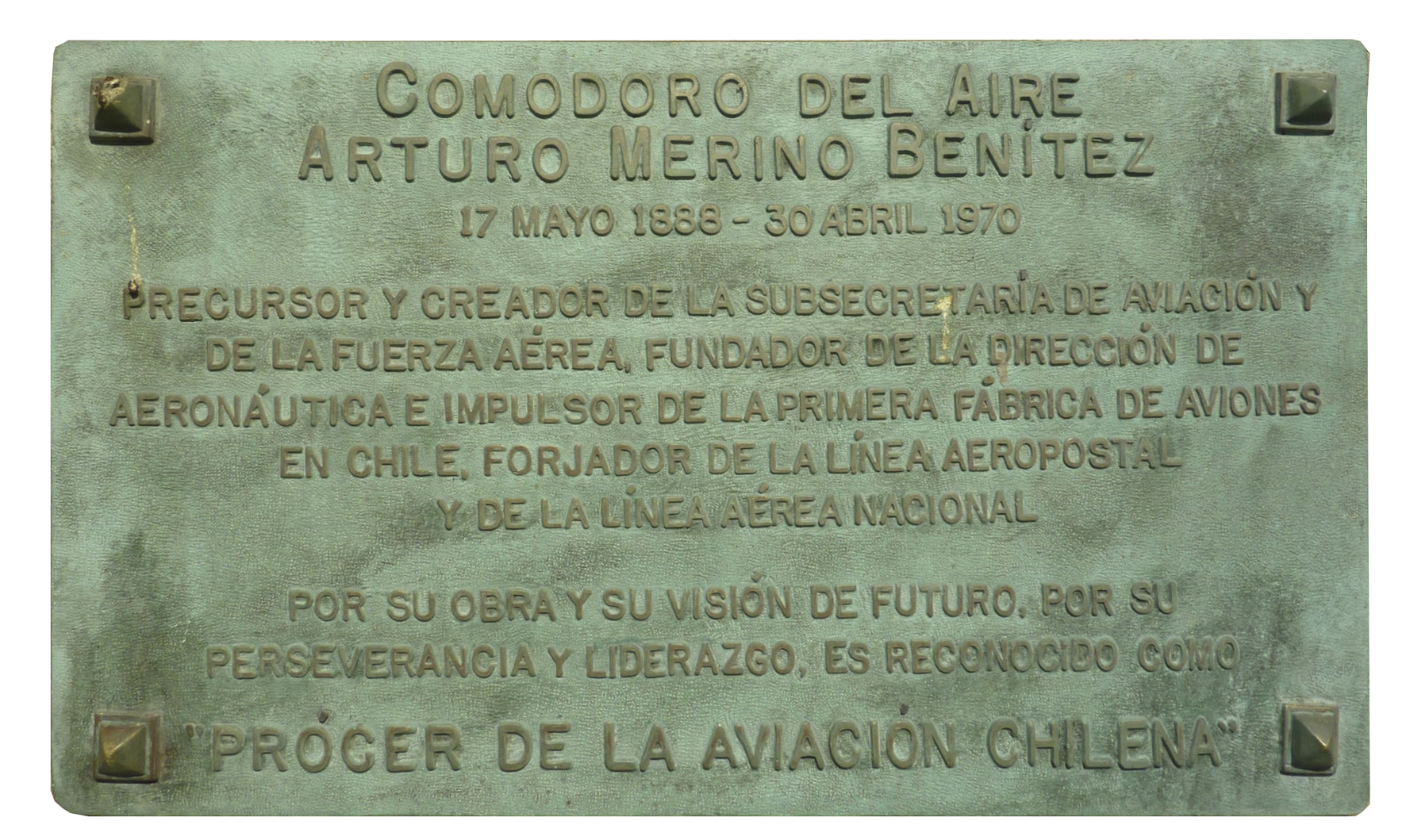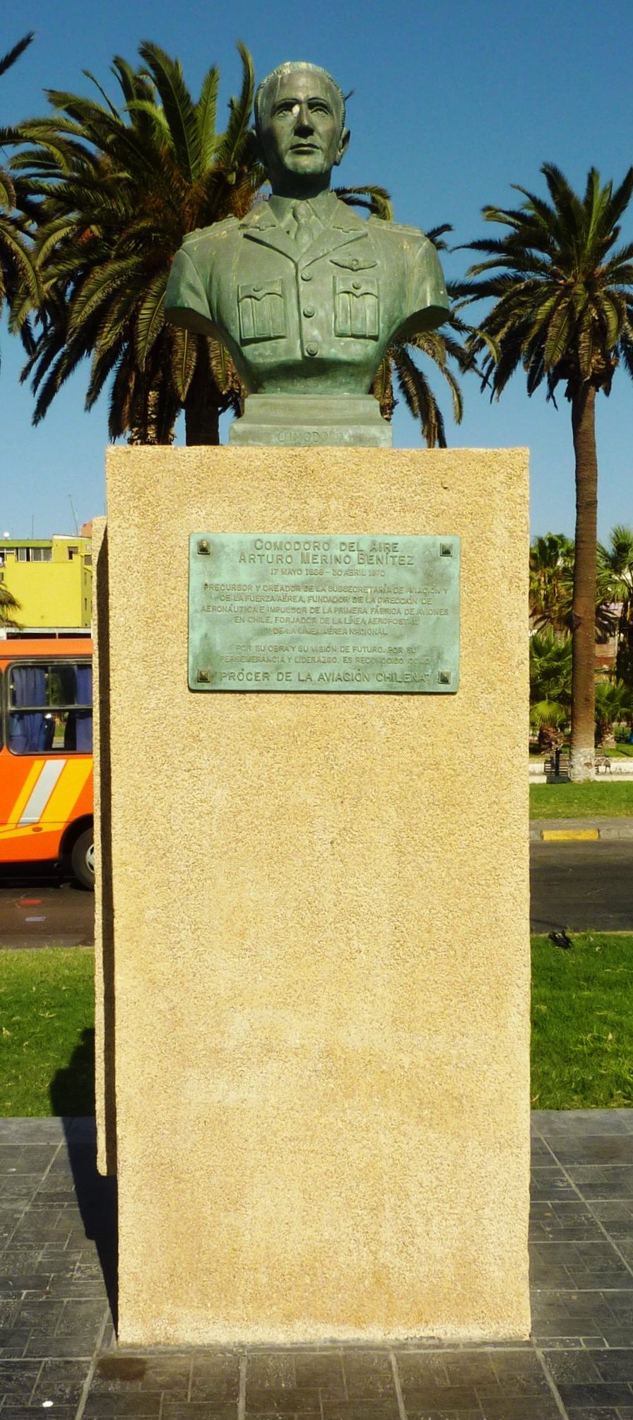 El monumento al Comodoro Arturo Merino Benítez en Arica se emplaza en el bandejón de la avenida Comandante San Martín, a los pies del Morro. Consiste en un busto de bronce sobre un plinto de concreto en el que se empotra una placa de bronce. Conmemora al precursor de la aviación chilena, fundador de la Fuerza Aérea de Chile, de la Línea Aérea Nacional, de la Dirección General de Aeronáutica Civil, de la Subsecretaría de Aviación, de la Línea Aeropostal y de la primera fábrica de aviones de nuestro país. Nacido en Chillán en 1888, Arturo Merino Benítez entró a los 15 años a la Escuela Militar, desde donde egresó como teniente del Ejército en 1908. Realizó una destacada y ascendente carrera militar, especializándose en la Academia de Guerra, donde consolidó sus ideas sobre la necesidad del desarrollo aeronáutico en Chile, tanto para la exploración de los territorios, como para eventuales enfrentamientos. En 1922 es asignado a la Embajada de Chile en Brasil como agregado militar. Allí tiene la oportunidad de conocer al capitán Diego Aracena, quien había realizado el vuelo más largo en Sudamérica hasta el momento. De regreso en nuestro país, Merino es nombrado director de la Escuela de Aeronáutica Militar y posteriormente de la recién creada Dirección de Aviación del Ejército.