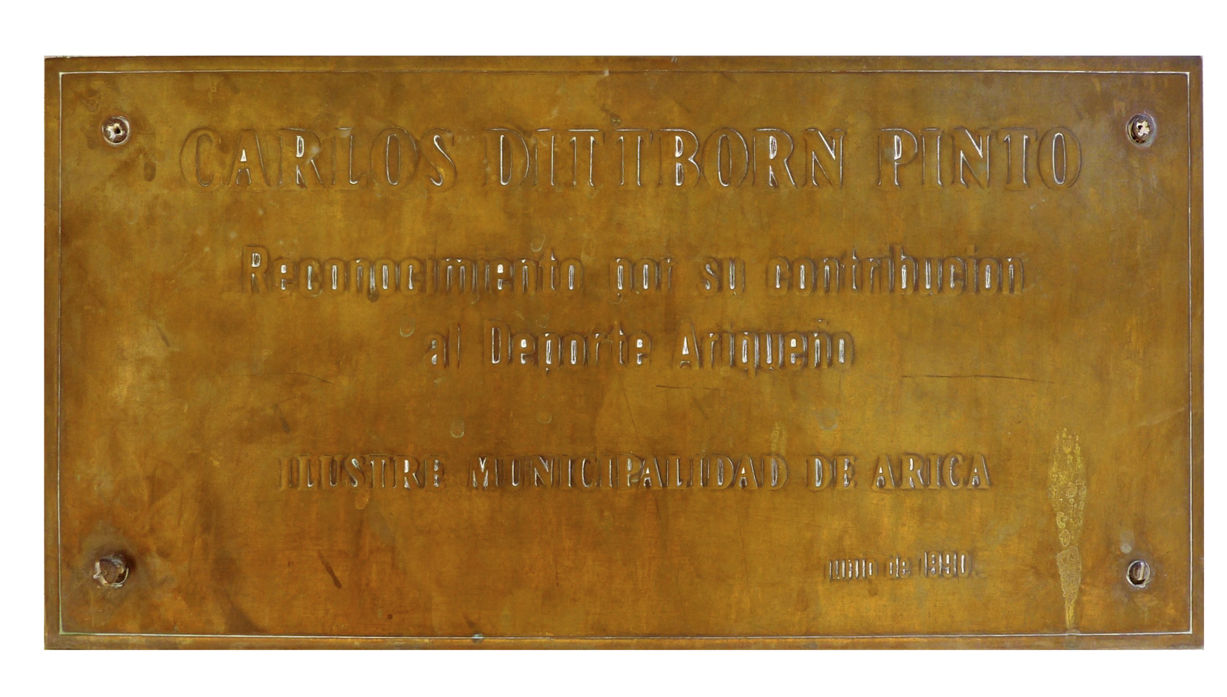 A la entrada del estadio Carlos Dittborn de Arica, que se encuentra ubicado entre las calles Magallanes, Tucapel y 18 de septiembre, se emplaza este monumento a la construcción del recinto deportivo, en el contexto del mundial de fútbol de 1962, con sede en Chile. El monumento consiste en una escultura de cemento revestido con marmolería que representa dos figuras humanas en disputa por un balón de fútbol. La base triangular es de cemento y en cada una de sus tres caras hay grabadas inscripciones que señalan los datos de su construcción. Posee, además, una placa de bronce, instalada en 1990 por mandato de la Municipalidad de Arica, que reconoce la contribución de Carlos Dittborn en el desarrollo del deporte ariqueño.