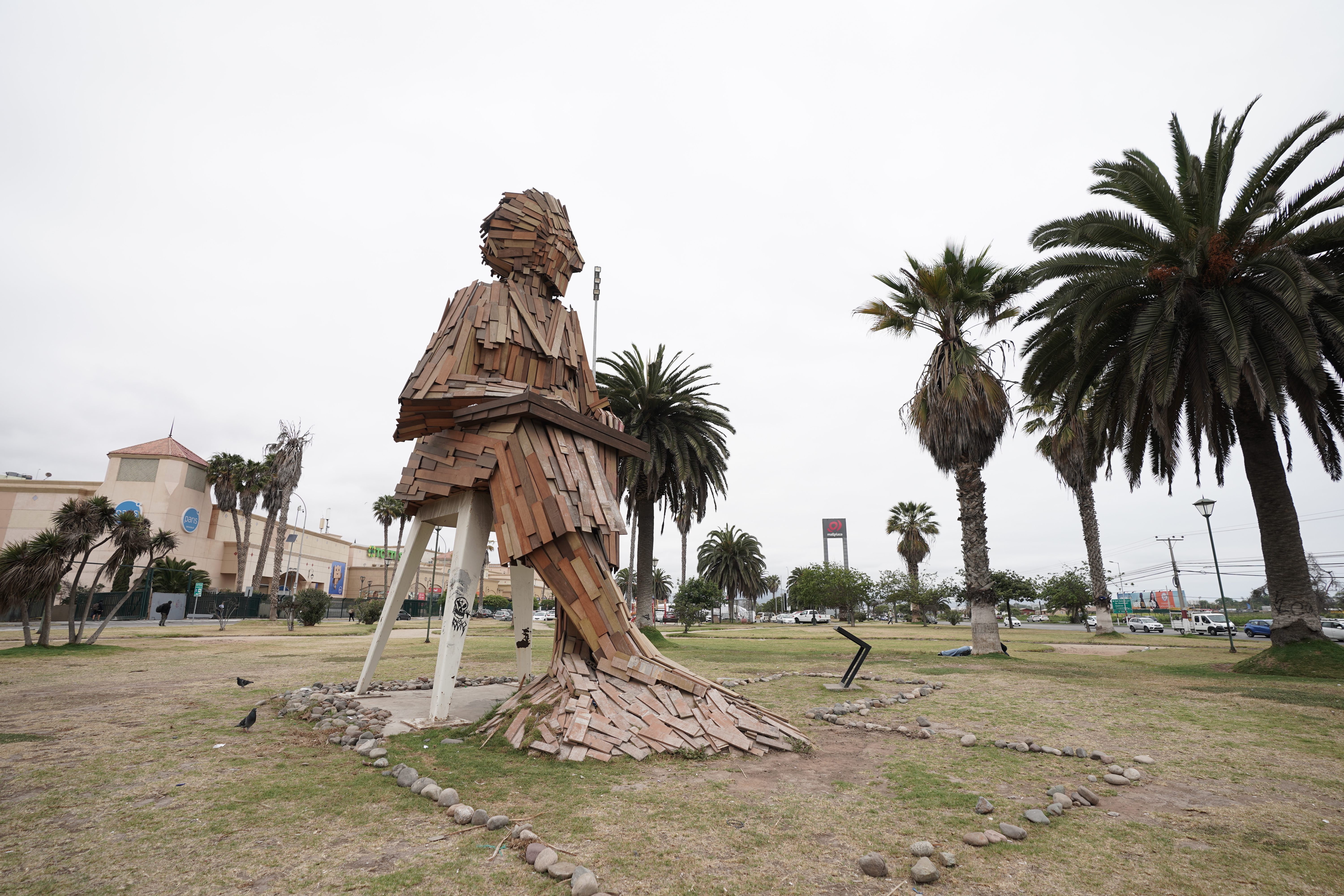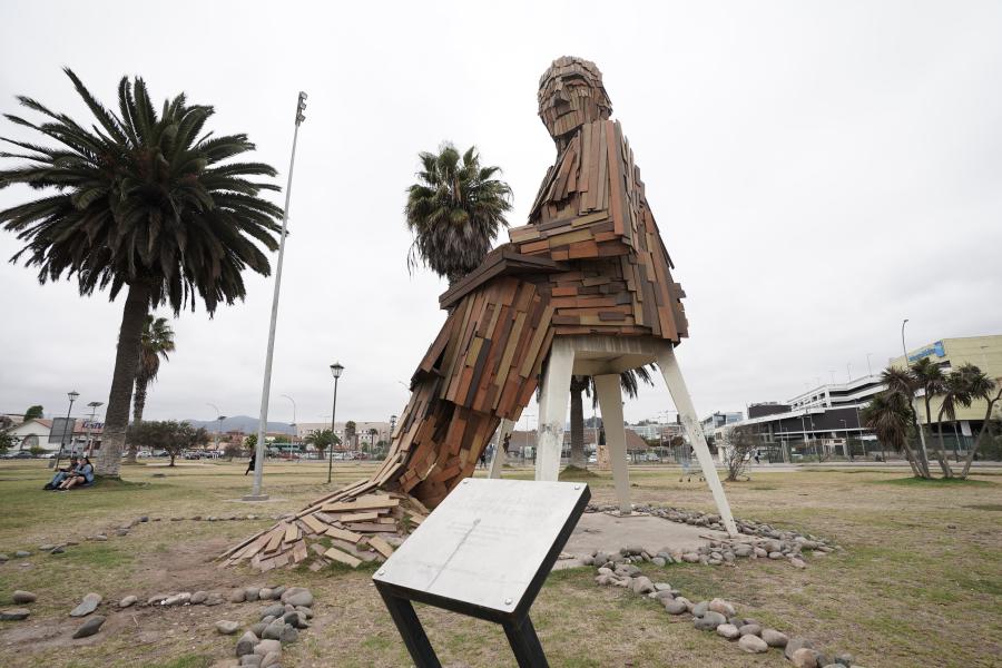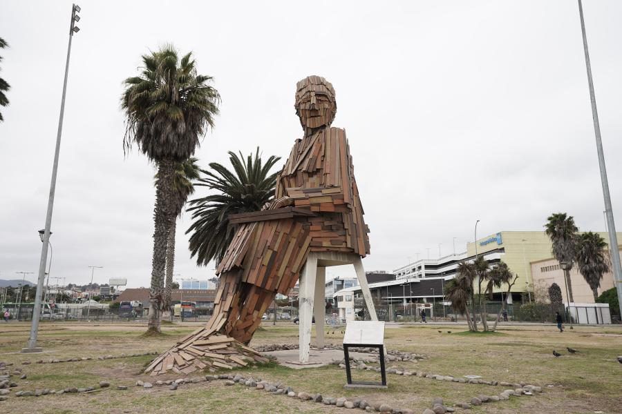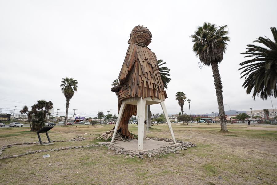 Es una escultura figurativa de 8 metros de altura y elaborada en madera, la escultura está sentada en una silla mirando al mar.