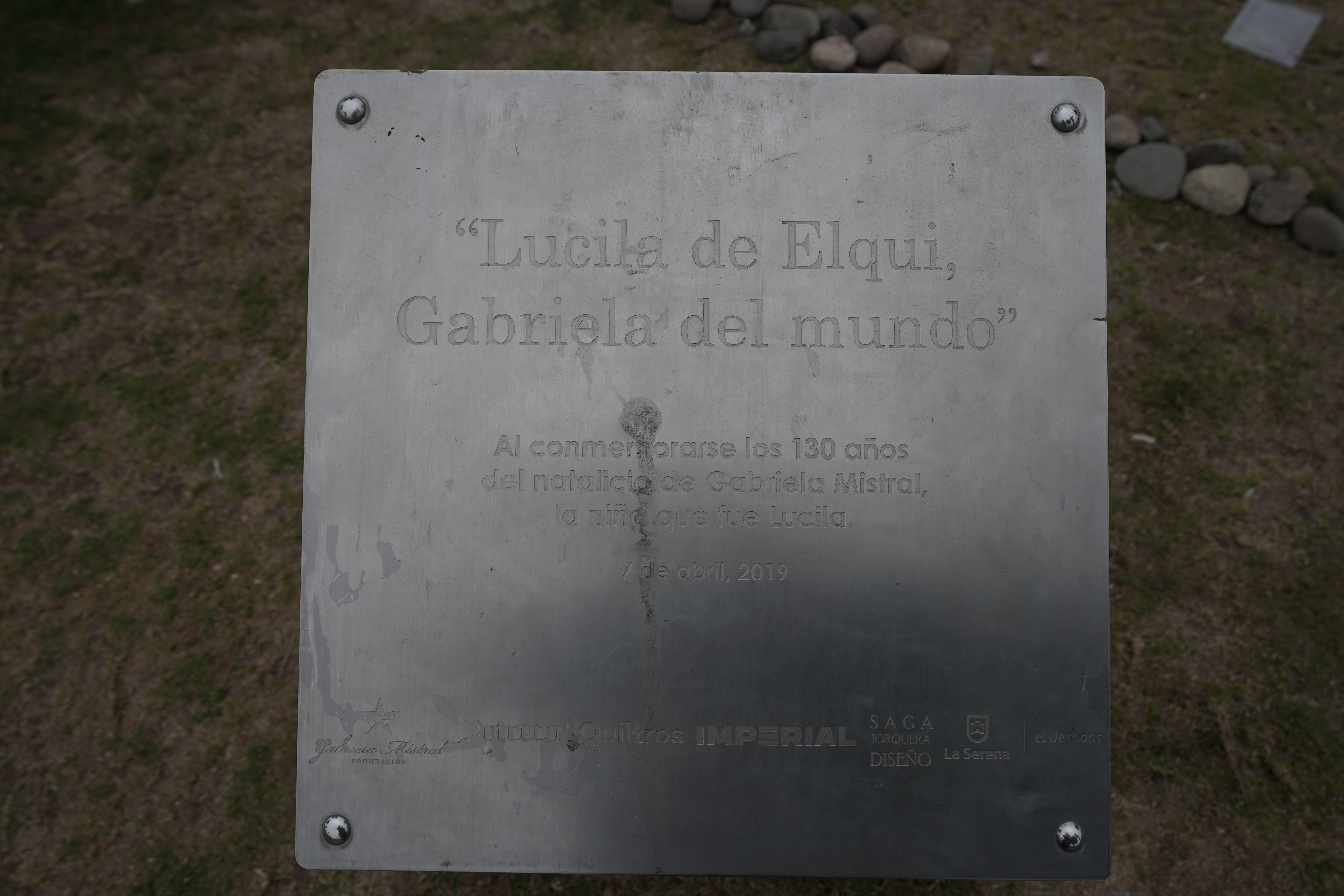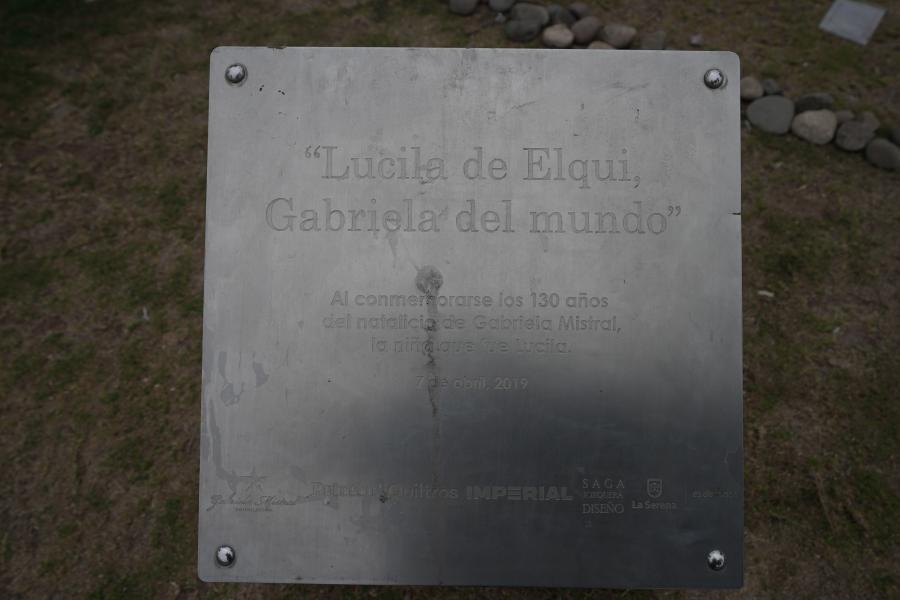 Posee una placa metálica con el texto "Lucila del Elqui, Gabriela del Mundo. Al conmemorarse 130 años del natalicio de Gabriela Mistral, la niña que fue Lucila".