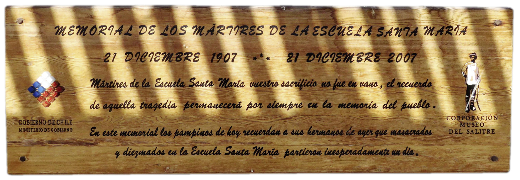 A la entrada del Cementerio N° 3 de Iquique se encuentra este memorial de madera, con base de concreto y placas de madera, que conmemora a los mártires obreros de la Escuela Santa María de Iquique. Construido por la Corporación Museo del Salitre y financiado por el Ministerio del Interior, fue inaugurado en diciembre de 2007, al cumplirse 100 años de la tristemente célebre matanza. Hacia 1907, las oficinas salitreras de la provincia de Tarapacá eran principalmente de capitales ingleses y, en menor cantidad, alemanes. En ellas, las condiciones de trabajo eran de explotación y abuso patronal: los trabajadores y sus familias vivían en pequeñas habitaciones en las mismas oficinasciudades; el pago por las extensas jornadas de extracción de mineral se efectuaba en fichas que sólo eran valor de cambio en las pulperías de la misma oficina; y por desobediencia a los reglamentos, los obreros eran sometidos a castigos, torturas y humillaciones de manera constante. En respuesta a este escenario se gestó la gran huelga de 1907, en la que participaron las familias obreras de decenas de oficinas salitreras, quienes bajaron hasta Iquique en diciembre de ese año. Se sumaron los trabajadores del puerto, de ferrocarriles y diversos gremios, afectados por la devaluación del peso respecto de la libra esterlina, con la consiguiente pérdida de poder adquisitivo. La población peruana y boliviana en la región de Tarapacá representaba más del 30% del total, pero en el seno de la clase, si bien había distintas tendencias (ácratas, demócratas y mancomunales, principalmente), a todos los unía la reivindicación de sus derechos.