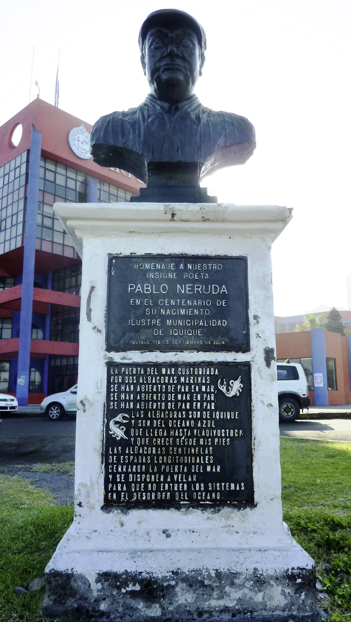 En el frontis de la Universidad Arturo Prat se encuentra este monumento a Pablo Neruda. Consiste en un busto de bronce pintado de negro brillante sobre una base de cemento en la que se empotran dos placas de bronce, una de las cuales contiene un fragmento del poema Albacoras y la otra señala su inauguración en septiembre de 2004, a cien años del nacimiento del poeta, por mandato de la Ilustre Municipalidad de Iquique. El busto conmemora al escritor, político y diplomático chileno, nacido en Parral en 1904 con el nombre de Neftalí Ricardo Reyes Basoalto. Muerta su madre al mes de haberlo dado a luz, vivió su infancia en la ciudad de Temuco, donde comenzó su actividad literaria en un entorno de naturaleza deslumbrante. Se mudó a Santiago a sus dieciséis años para estudiar francés en el Instituto Pedagógico de la Universidad de Chile, ambiente que propició su interacción con los poetas de la generación del ‘20, como Juvencio Valle y Alberto Rojas Jiménez. Bajo el seudónimo que lo haría mundialmente reconocido, publica sus primeros libros, Crepusculario y Veinte poemas de amor y una canción desesperada, ambos de marcado estilo romanticista y modernista.