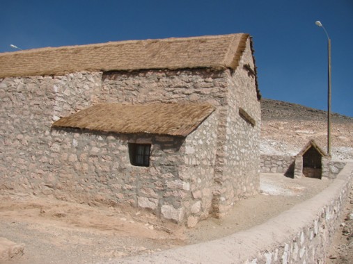 Dentro de los edificios destacados del poblado, está su Iglesia. Construida a partir de piedra y barro muy bien labrado, posee dos capillas laterales, un tradicional campanario y un techo de dos aguas de paja brava. Los muros al interior de la iglesia están decorados con frescos que datan del siglo XIX. Posee un altar mayor con cuatro nichos adornados bajo un estilo que podría llamarse "barroco rústico" y que correspondería al año indicado en su frontis: 1784. En las cuatro esquinas del amplio patio alrededor de la capilla hay templetes o "pozas" de forma singular, muy común en este tipo de construcciones. Sus muros blancos contrastan con los dinteles y pórticos de color celeste. A la iglesia se suma el piso y sendero peatonal levantado con rocas extraídas de canteras cercanas, un cementerio y milenarios sitios arqueológicos.