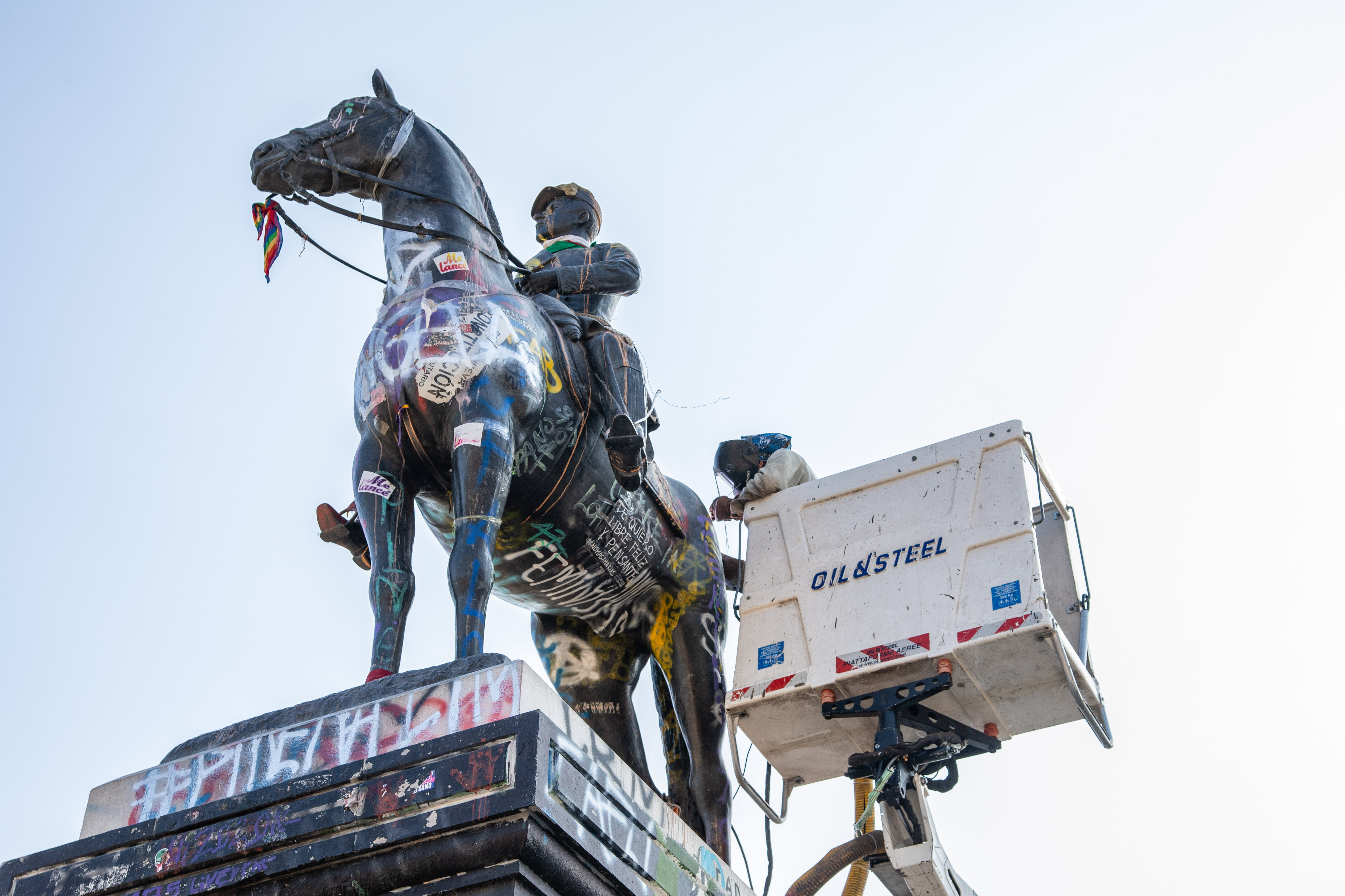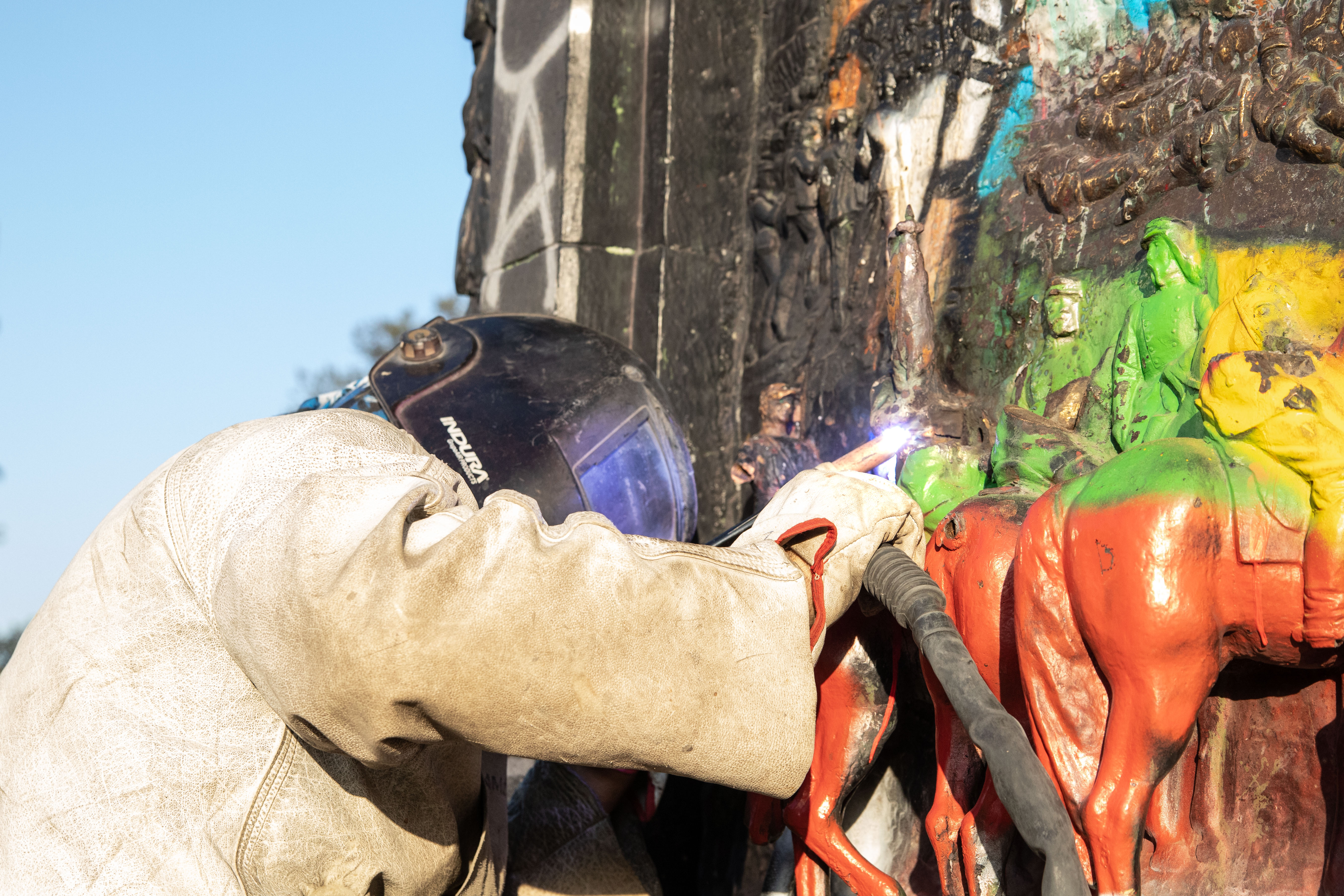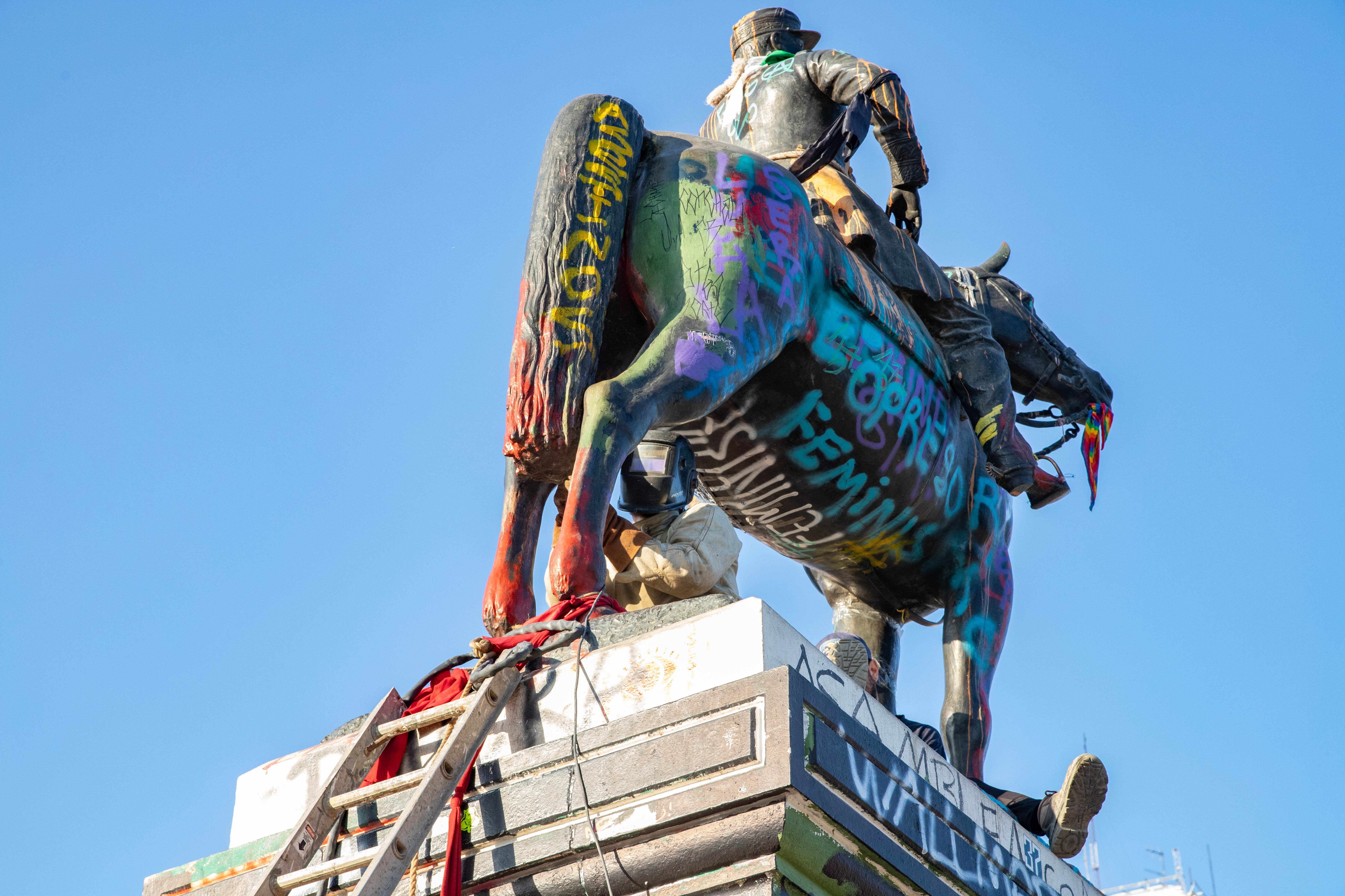 Esta mañana, a primera hora y coordinados por la Secretaría Técnica del Consejo de Monumentos Nacionales (CMN) del Ministerio de las Culturas, las Artes y el Patrimonio, comenzaron los trabajos de instalación de nuevas fijaciones y refuerzos de las piezas a la estructura del monumento. El escultor, restaurador y académico Luis Montes explicó que las obras preventivas consistieron “en un reforzamiento estructural a través de soldaduras auxiliares, que cumplen un papel reestructurante, especialmente en la cola. Allí se aplicó un cordón de reforzamiento de soldadura en la juntura de la pieza con el caballo y también dos puntos auxiliares en la parte inferior, junto a las patas, para evitar la oscilación”.
